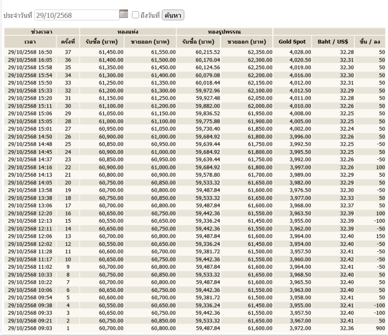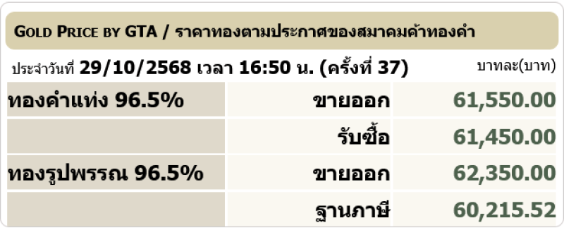 ราคาทอง ปิดตลาดวันที่ 29 ตุลาคม 2568