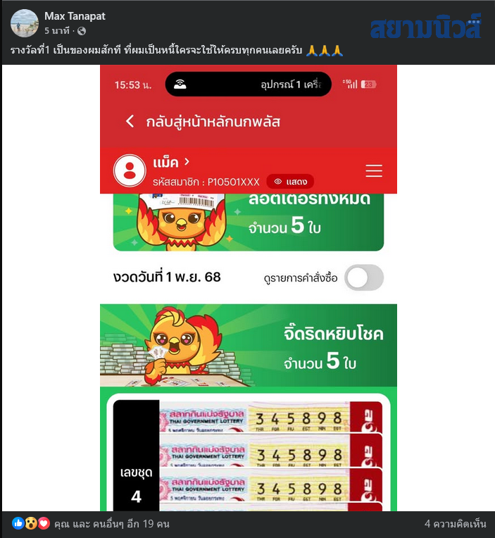 และหนึ่งในผู้โชคดีนั้นได้แก่ คุณแม็ค ผู้โชคดีจากจังหวัดกรุงเทพฯ ถูกรางวัลที่ 1 จำนวน 24 ล้านบาท บอกว่า ก่อนคุณนอทจะโทรมา ตนเป็นอาสาเพิ่งส่งคนเจ็บเสร็จ เห็นในโทรศัพท์ขึ้นแจ้งเตือนจาก แอป นกพลัสว่า คุณถูกรางวัลที่ 1 ทำให้รู้เลยว่าสายนี้จากคุณนอท โทรมาบอกว่าตนถูกรางวัลที่ 1