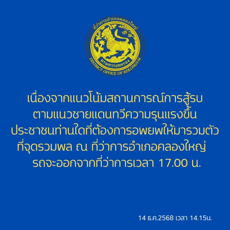 วันที่ 14 ธันวาคม เวลา 14.16 น. เพจที่ว่าการอำเภอคลองใหญ่ จังหวัดตราด ได้เผยแพร่ประกาศแจ้งเตือนประชาชนในพื้นที่ อำเภอคลองใหญ่ ให้เตรียมความพร้อมกรณีต้องการอพยพออกจากพื้นที่ เนื่องจากแนวโน้มสถานการณ์การสู้รบตามแนวชายแดนมีความตึงเครียดและทวีความรุนแรงมากขึ้น