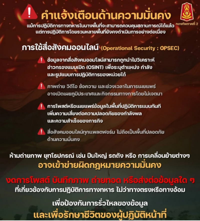 เพื่อเป็นการปกป้องชีวิตผู้ปฏิบัติหน้าที่ กองทัพภาคที่ 2 ขอความร่วมมือในการใช้สื่อสังคมออนไลน์ แบบ OPSEC (Operations Security)