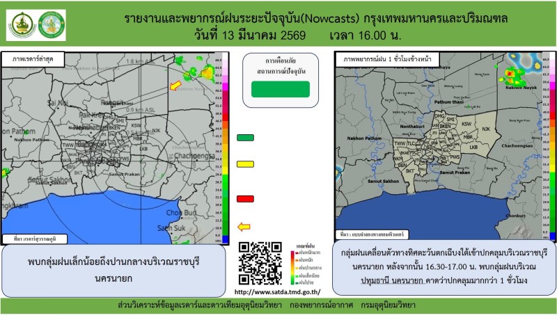 วันที่ 13 มีนาคม 2569 กรมอุตุนิยมวิทยา รายงานการตรวจพบกลุ่มฝนเล็กน้อยถึงปานกลางในหลายพื้นที่ โดยพบกลุ่มฝนเริ่มก่อตัวบริเวณจังหวัดราชบุรีและนครนายก ก่อนจะเคลื่อนตัวตามกระแสลมไปทางทิศตะวันตกเฉียงใต้ ส่งผลให้กลุ่มเมฆฝนขยายตัวเข้าปกคลุมพื้นที่ดังกล่าวในระยะต่อมา